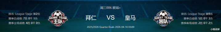 拜仁首回合客场2-1击败皇马,手握1球优势回到安联球场。近3场战绩3战全胜状态火热,客场3-2力克弗赖堡,欧冠客场2-1战胜皇马,客场5-0狂胜圣保利,3场比赛进10球失3球,进攻端场均超过3球,防守端仅失3球,攻防两端表现均衡。球队目前士气高涨,连续客场大胜展现强大战斗力。伤病方面虽有8人缺阵,包括格纳布里,乌尔赖希等,但阵容深度足以应对,主场作战且手握优势。